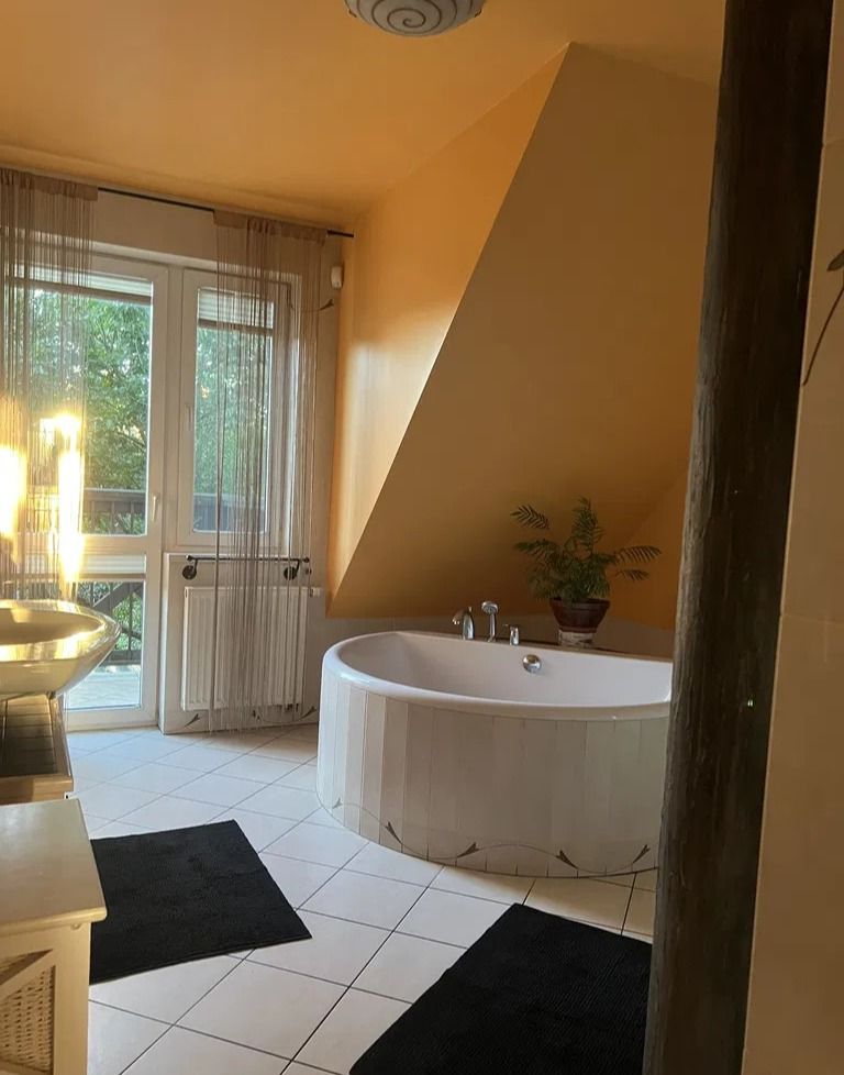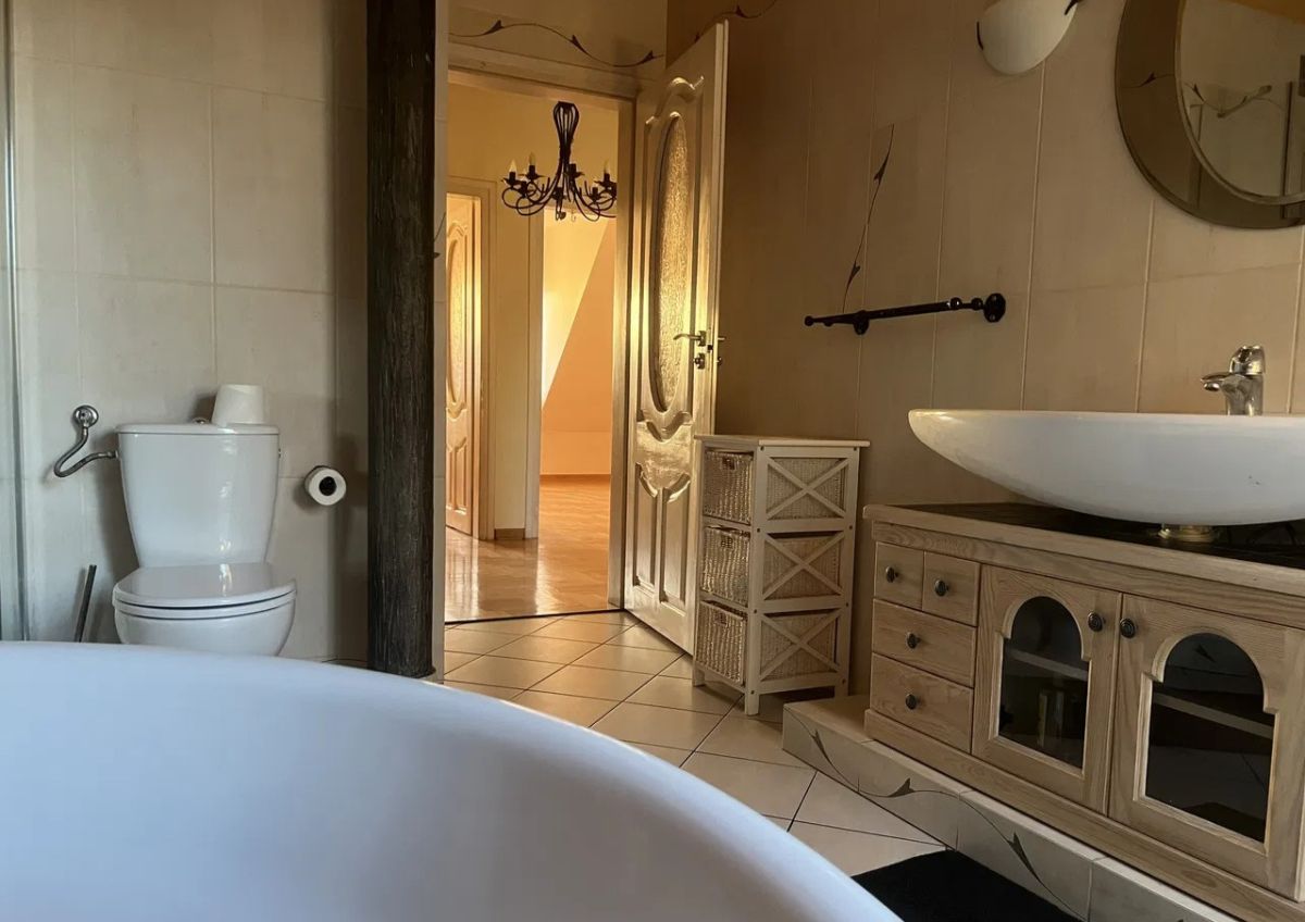 Piętro: trzy sypialnie, garderoba z pralnią i suszarnią, pokój kąpielowy z dużą wanną, prysznicem i wyjściem na balkon;