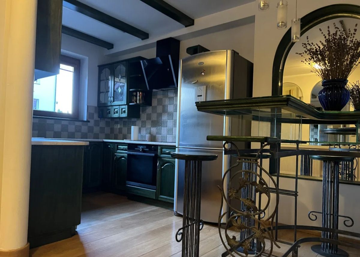 Podłogi dębowe, zabudowy stałe w łazienkach, garderobie, na poddaszu, w pomieszczeniu gospodarczym, wiatrołapie (szafki drewniane z jesionu) oraz kuchni wyposażonej w płytę indukcyjną, piekarnik, zmywarkę.