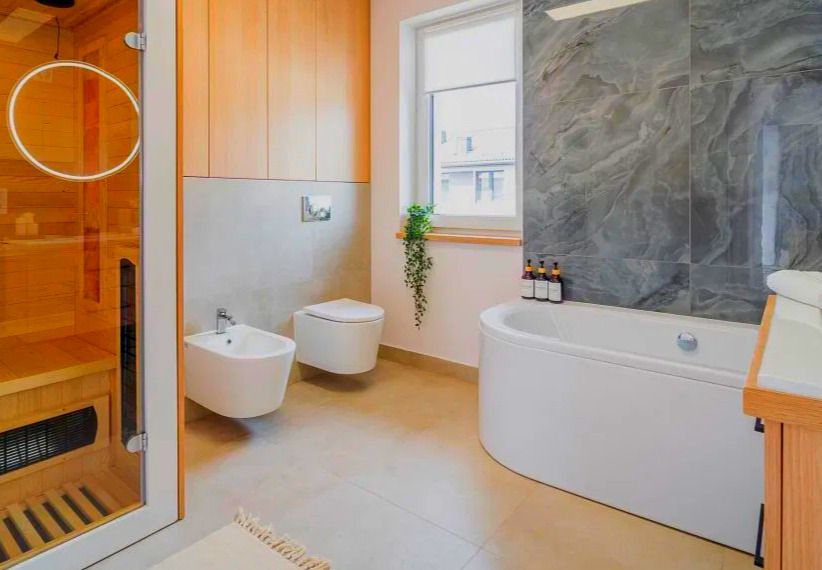 Piętro: 3 sypialnie,holl i duża łazienka z wc, wanną, bidetem i sauną na podczerwień.