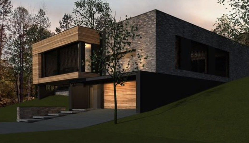 Nieruchomość sąsiaduje z domami jednorodzinnymi położonymi dużo niżej niż działka.